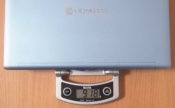タッチパネル搭載モデルの場合は実測で918g (公式サイトでの表示は939g)、非搭載のモデルでは実測838g (公式サイトでの表示は861g、または891g)となっていました。タッチパネル非搭載モデルで2種類の重さがあるのは、搭載するCPUによって重さが変わるからのようです。