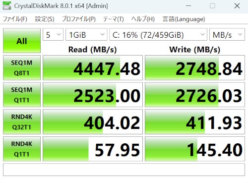 SSDの読み書きの速度を計測しました。高速に動作するSSDです。パソコンの動作が快適になります。