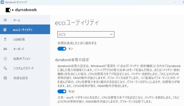 dynabook RA/ZYではecoユーティリティ機能を使うことができるようになっていて、dynabook省電力設定を切り替えることができます。普段は無効の状態になっているのですが、これを有効にし、パソコンの設定の電源モードを「最適な電力効率」に設定すると、静かにパソコンの動作音を抑えて使うことができるようになります。