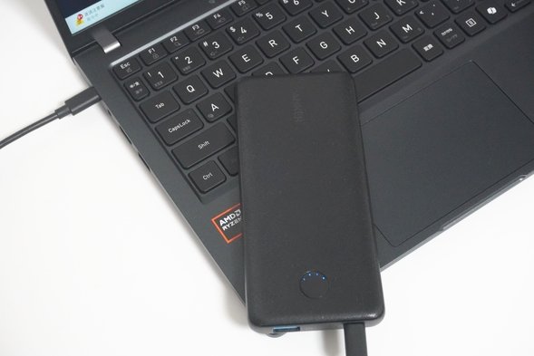 スマホ用のモバイルバッテリーを使って、dynabook RA/ZYを充電しているところ。