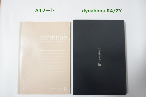 dynabook RA/ZYの上にA4ノートを重ねたところ。