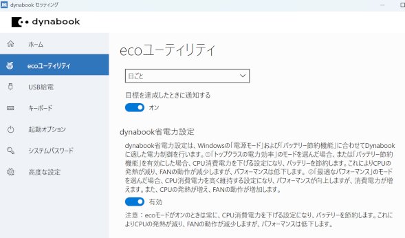 dynabookの設定アプリから利用できる「dynabook省電力設定」機能。