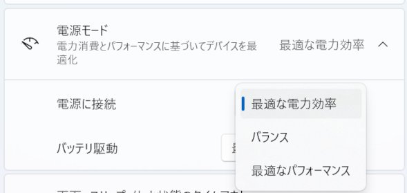 通常はバランスモードで特に問題なく使うことができると思います。もし、動作音を抑えたいなと思ったら、最適な電力効率モードに設定してみると良いでしょう。