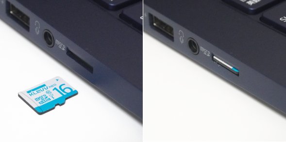 micro SDカードスロットになりますが、データを保存するためのSSDの容量が少なくなってきた時にmicro SDカードを利用すれば、ストレージとして活用できるのがとても便利です。