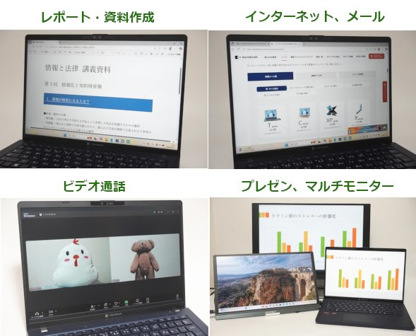 大学の講義で課されるレポート作成や書類の参照・作成、インターネットやメール、プレゼンやマルチモニターでの作業など、幅広い用途にしっかり対応することができます。