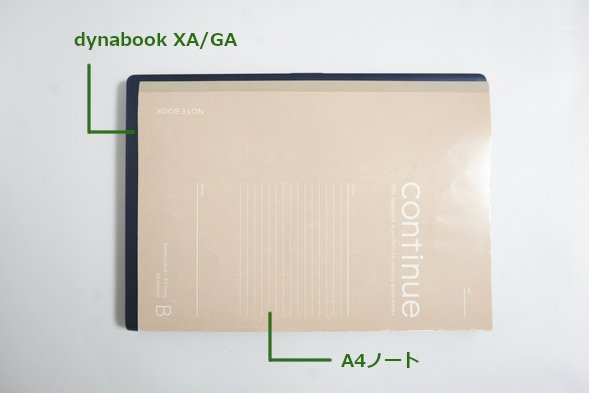 下の写真はdynabook XA/GAの上にA4ノートを重ねてみたところです。A4ノートとほぼ同じサイズ感でした。これくらいのサイズだと作業がしやすく、そしてカバンにもスッキリ入るので使いやすいです。