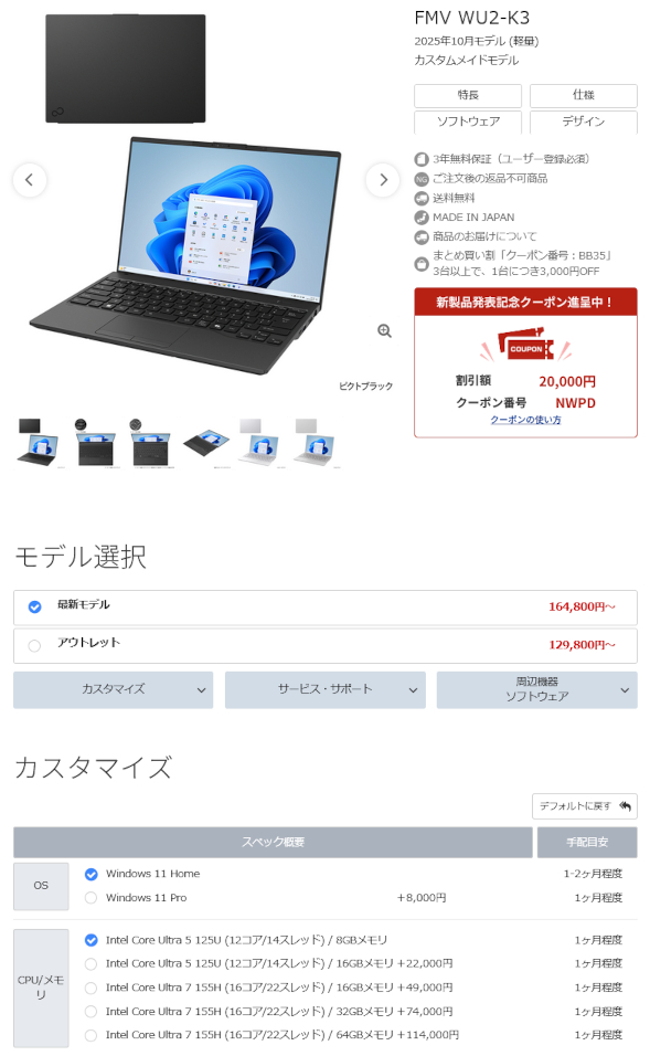 富士通の直販サイトであるWEB MARTでは、CPUやメモリなどノートパソコンをカスタマイズして購入することができます。