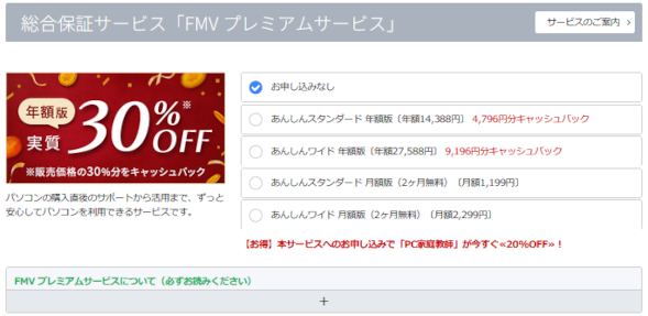 総合保証サービス(FMVプレミアムサービス)というのは、他社周辺機器やソフトの使い方などを電話で教えてもらえたり、メーカー保証終了後もパソコンの修理が年1回無料になったり、パソコンソフトが使い放題になったりするサービスです。