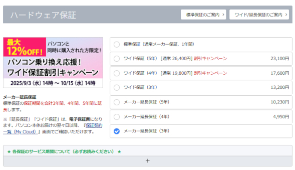 一般的なメーカー保証はハードウェア保証で選択できます。オンラインの直販サイトWEBMARTで購入すると、多くの製品が標準で3年のメーカー保証に対応しているのが大きなメリットです。追加料金なしで3年も保証されるのでとても安心です。