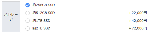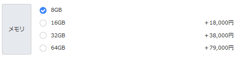 選択できるメモリ容量はモデルによって違いますが、8GB / 16GB / 32GB / 64GBなど、複数の選択肢が用意されています。