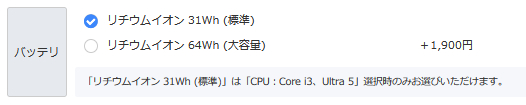 バッテリーが選択できるモデルもあります。Whの値が大きいほど長時間バッテリーが持続します。ただし、その分重量が若干増えますので、持ち運びを考えるのであれば重さとバッテリー持続時間のバランスを検討してみてください。