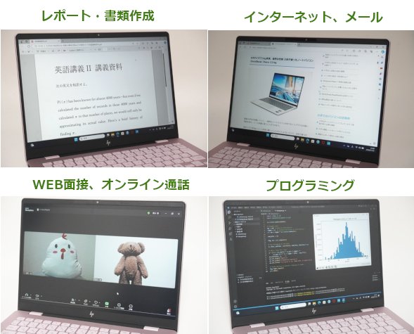 WordやExcelを使ってレポートや資料を作成するのはもちろんのこと、インターネットやメール、プレゼンなどにもしっかり対応できます。また、ZoomやTeamsなどのビデオ通話ソフトを使ったWEB面接やオンライン通話も問題ありませんし、プログラミングなどの用途にもしっかり使える性能です。