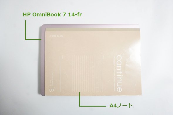 サイズは14インチとなっていて、本体とA4ノートの大きさを比べると、以下の写真のようになりました。縦・横ともにA4よりも1cm程度大きいだけのサイズ感です。ほぼA4と思ってもらって大丈夫です。