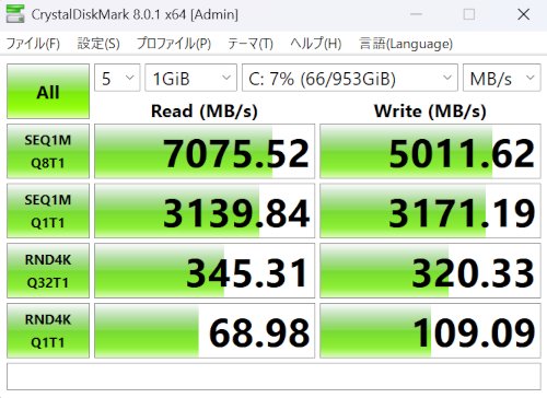 SSDのアクセス速度になります。読み書きともに非常に高速に動作します。