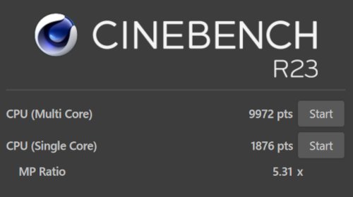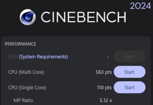 CPUの性能をCINEBENCH R23とCINEBENCH 2024という2つのソフトで計測しました。それぞれ、9972pts、563pts (マルチコア)となりました。