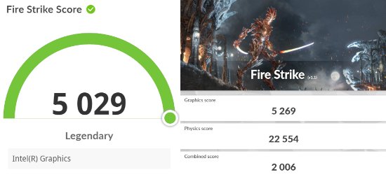グラフィックスはCPUに内蔵されているものになりますが、一般向けのノートPCのグラフィックスとしてはとても高いです。NVIDIA GeForce MX550と同程度の高いスコアになっていて、かなり良い性能です。