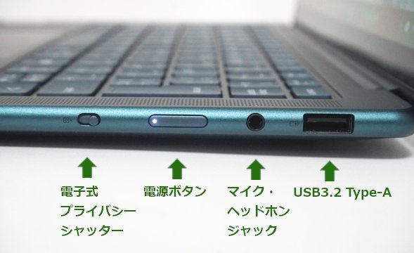 右側面です。電子式プライバシーシャッター、電源ボタン、マイク・ヘッドホンジャック、USB3.2 Type-Aポートがあります。