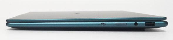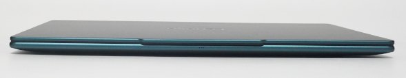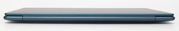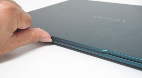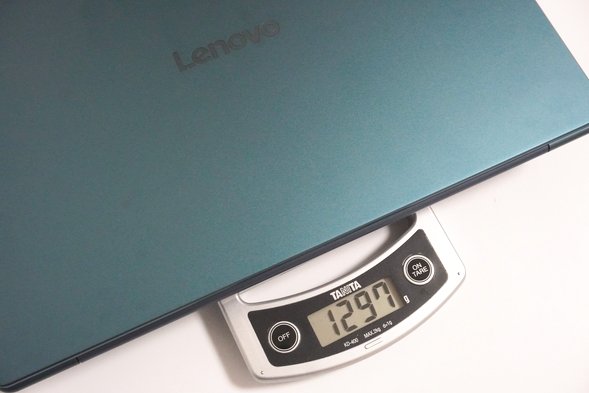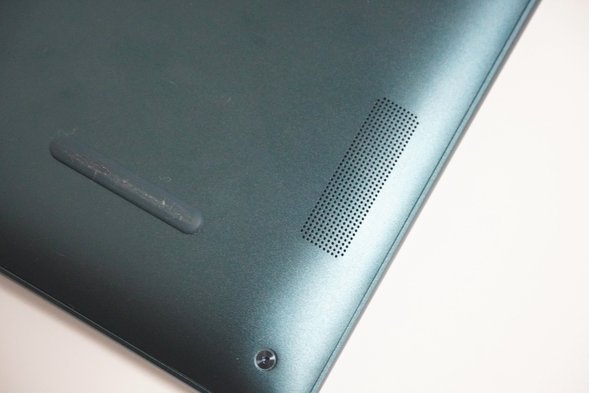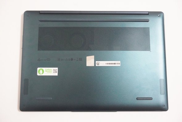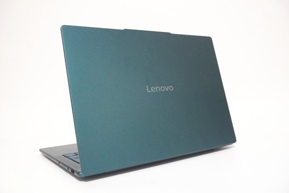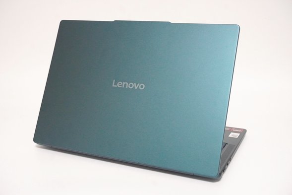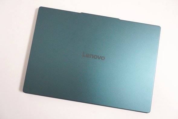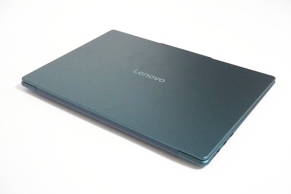 天板部分です。タイダルティールと呼ばれるカラーがとても上品な印象を受けます。Lenovoのロゴが中央に刻印されていて、シンプルなデザインです。