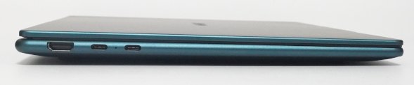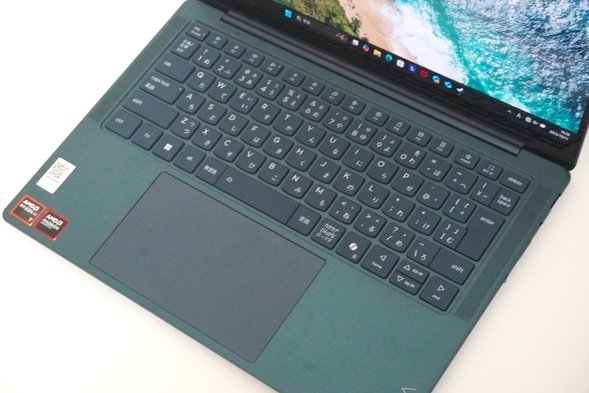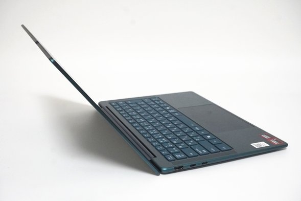 Lenovo Yoga Slim 7 Gen 10 (14型 AMD)は、タイダルティールという上品さを感じさせるカラーのノートパソコンです。青~緑に見える色合いです。