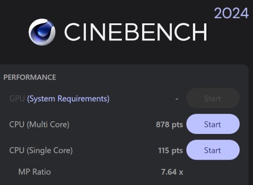 CPUのベンチマークを計測すると、スコアはそれぞれ14923pts、878ptsとなり、非常に高いスコアを示しました。とても快適に使える性能で、高速に動作します。また、シングルコアのスコアもとても高く、こちらも非常に良い性能です。