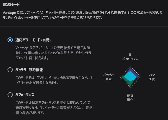 標準では適応パワーモードになっています。バッテリー節約機能モードにすると、ファンの回転音が小さくなってより静かに使うことができるようになります。図書館などで静かに使いたい時などで活用することができるでしょう。