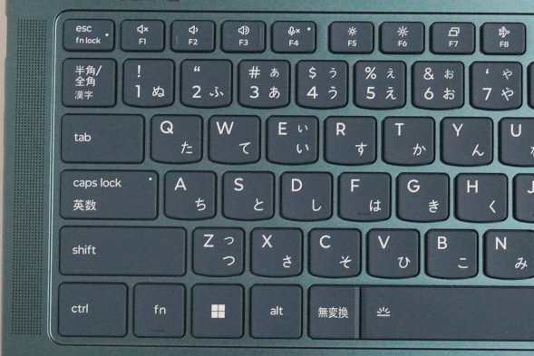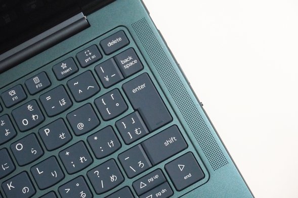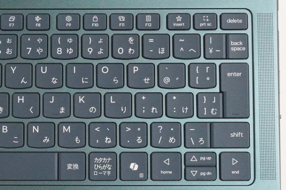 キーボードは下の写真のようになっています。スタンダードな日本語配列のキーボードです。キーの下側が丸みを帯びていて、ソフトな印象を受けます。両端にあるのはスピーカーになります。