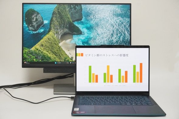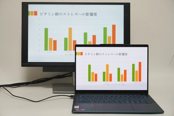 プレゼンではPCの画面をモニターやプロジェクターに映し出して発表を行いますが、Lenovo Yoga Slim 7 Gen 10 (14型 AMD)にはHDMIポートが搭載されていますので、PCとモニターなどの機器をHDMIケーブルでつなぐだけで簡単にプレゼンを行うことができます。