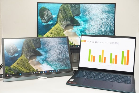PCとモニターをHDMIケーブル、ならびにUSB Type-Cケーブルでつないだところ。3画面とも異なる画面を表示させることも、同じ画面を表示させることもできる。