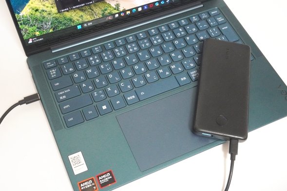 そんな時でも安心なように、Lenovo Yoga Slim 7 Gen 10ではUSB Type-Cポートにモバイルバッテリーを接続することで、パソコンの充電を行うことができます。