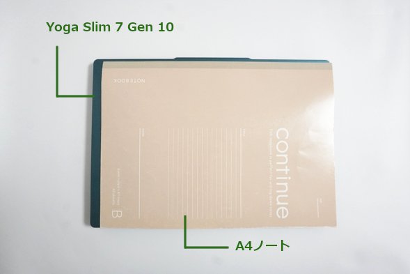 Lenovo Yoga Slim 7 Gen 10 (14型 AMD)の上にA4ノートを重ねて置いたところ。