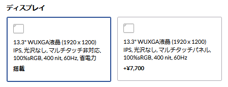 解像度の異なるディスプレイや、タッチ対応/非対応などが選択できます。解像度が上がれば価格も上がりますし、タッチ対応にしても価格が上がります。