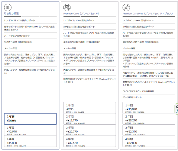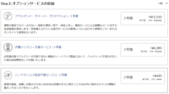 保証期間の延長や、落下、水濡れ、火災などの事故による保証サービスを追加することができます。いずれも、購入画面で選択することができます。