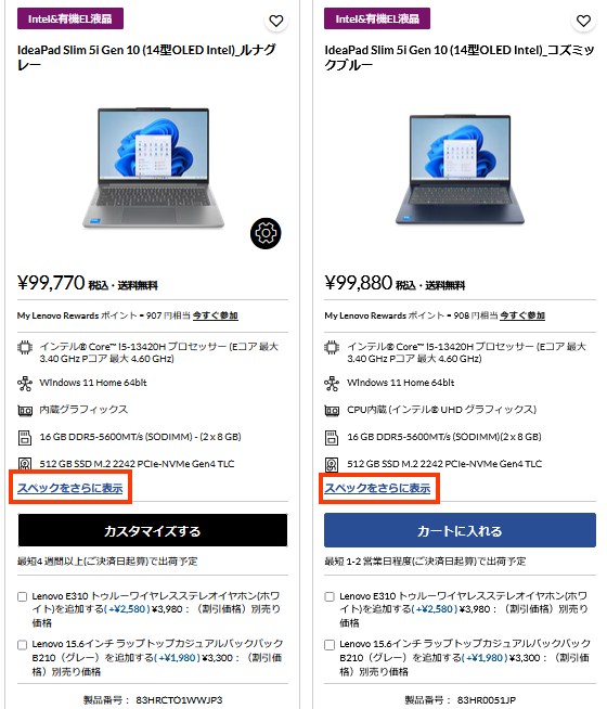 カスタマイズできるものでも、カスタマイズできないものでも、両者ともにモデル一覧画面では、「スペックをさらに表示」(PCで見ている場合)、「もっと見る」(スマホで見ている場合)という文字が表示されています。