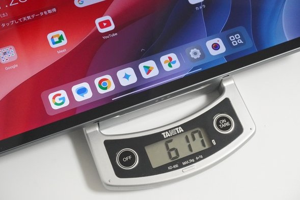 重さを実際に量ってみると617gでした。とても軽いです。1.2kgのノートパソコンの約半分くらいなので、とても軽いことがわかります。