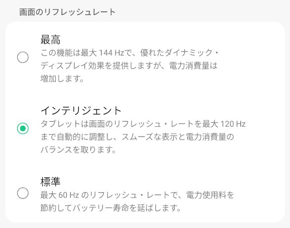 普段はインテリジェントモードになっていて、電力消費(バッテリー消費)とスムーズな表示のバランスをとってくれるモードになっていて、最大で120Hzのリフレッシュレートとなっています。
