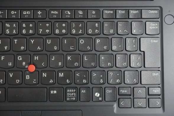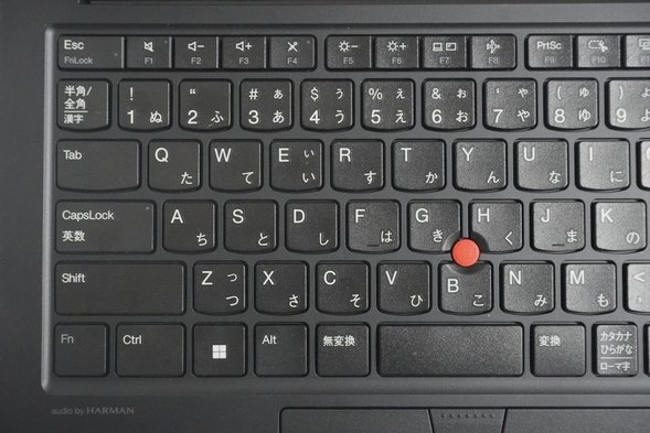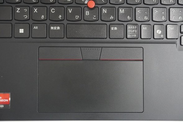 キーボードとフレームのカラーもブラックで統一されています。キーボード中央の赤いトラックポイントが良いアクセントになっています。