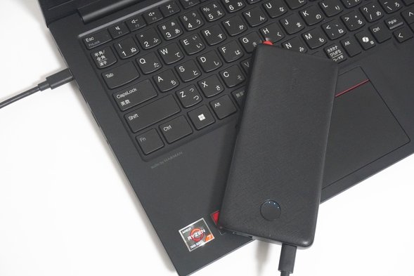 Power Deliveryに対応したモバイルバッテリーや充電器を使うと、USB Type-CポートからPCの充電を行うことができます。PCの電源がON・OFFにかかわらず、20W以上であれば充電が可能でした。