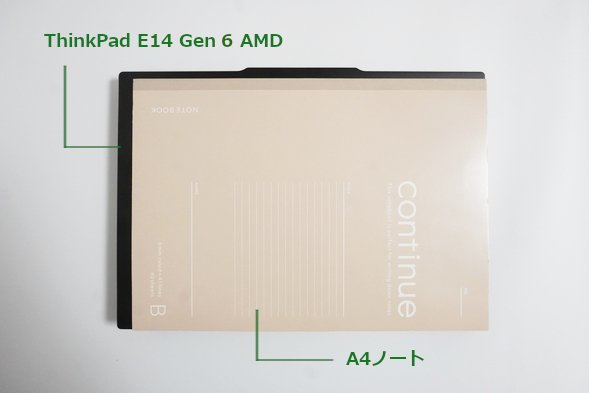 Lenovo ThinkPad E14 Gen 6 AMDは14インチのサイズのノートパソコンです。下の写真のように、A4サイズよりもほんの少し大きいくらいの大きさになっているので、大きすぎて邪魔になるということもなくて扱いやすいです。また、14インチの画面サイズがあるのでより広く使え、作業がしやすくなっています。
