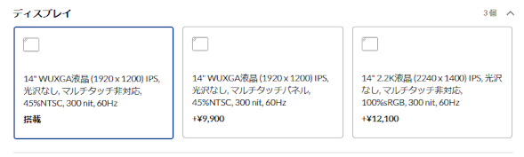 ディスプレイのサイズは14インチです。多くのモデルで解像度は1920×1200 (WUXGA)となっていますが、2240×1400 (2.2K)のディスプレイも選択できます。
