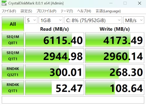 SSDへのデータの読み書きの速度を測定しました。SSDなので高速な動作が可能です。問題なく使えるでしょう。SSDの読み書きの速度についても、前モデルよりも高速になっています。