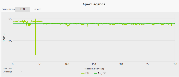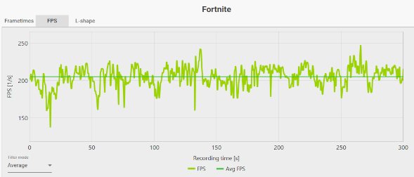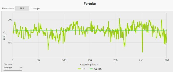 以下のグラフはフォートナイトを5分間プレイした時のフレームレートの変化の様子になります。その下の表は、各モードでの平均フレームレートになります。