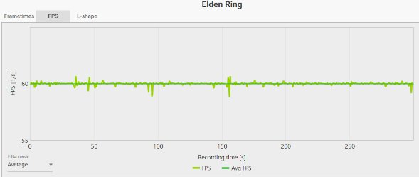 エルデンリングを約5分間プレイした時のフレームレートの変化の様子(品質:高)。
