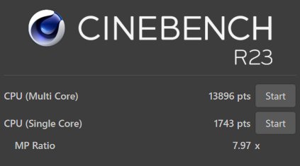 CPUの性能をCINEBENCH R23と2024という2つのソフトを用いて測定しました。スコアはそれぞれ13896pts, 800ptsとなりました。現在販売されているノートPCの中でもハイスペックな性能を発揮しています。非常に高速な処理が可能です。
