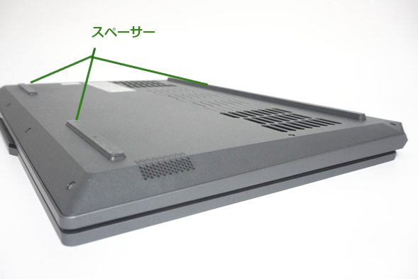 底面にはスペーサーがあって、底面と机の間にわずかな空間ができるように設計されています。換気口からの空気の流れがスムーズになるようになっています。