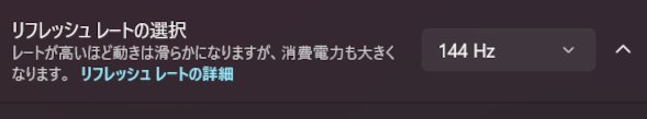 画面を1秒間に何回更新できるかというリフレッシュレートは、144Hzとなっています。一般的な60Hzのディスプレイと違って、とても滑らかな表示です。