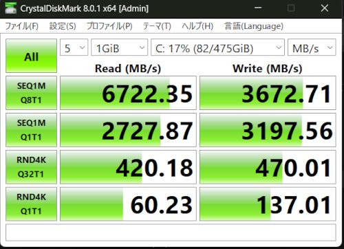 SSDの読み書きの速度を計測しました。読み書きともに高速で快適に動作します。