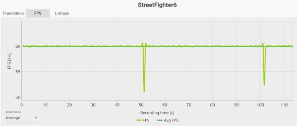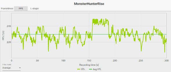以下のグラフはモンスターハンターライズを5分間プレイした時のフレームレートの変化の様子になります。その下の表は平均フレームレートになります。