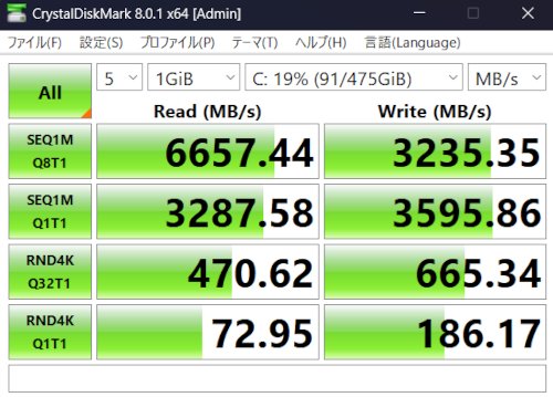 SSDの読み書きの速度を計測しました。読み書きともに高速で快適に動作します。