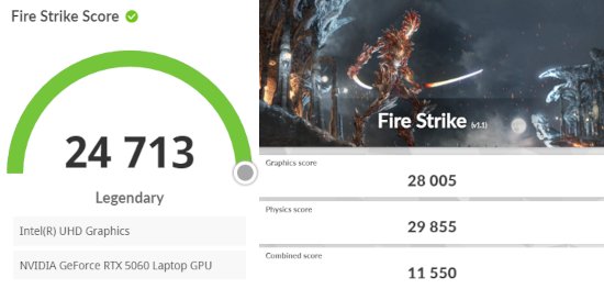 このスコアは、上述のパソコンのパフォーマンスを制御できる機能でバランスモードに設定したときのものです。パフォーマンスモードにすると、スコアは24713 → 27033 (Fire Strikeのスコア)となり10%近くも上昇しました。