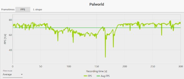 最大FPSは無制限にしていますが、フレームレートの平均は69.3fpsでした。ただ、Lenovo LOQ 15IRX10よりも高性能なゲーミングノートPCでパルワールドをプレイしてみても同程度のフレームレートだったので、ゲームの設定的にこういうものなのかもしれません。